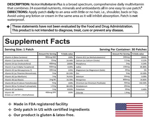 The body requires essential nutrients and minerals in steady and adequate amounts to be at its best and function properly. The PatchMD Multi Plus® Topical Patch is specially formulated with key nutrients to address the necessary intake of these vitamins for both men and women.